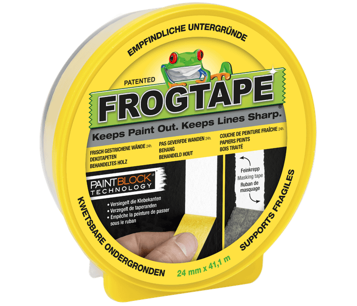 Frog tape ist ein spezielles Klebeband mit Farbblock. Während bei anderen Malerbändern die Farbe oder der Lack oft unter das Band läuft, versiegelt FrogTape automatisch die Kanten. Sobald der Paintblock mit wasserbasierter Farbe in Berührung kommt, entsteht ein Gel, das eine Mikrobarriere bildet.