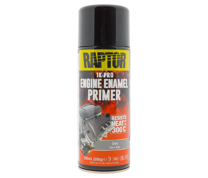 Raptor Engine Enamel Primer Spraydose ist eine graue Grundierung, die bis zu 300°C hitzebeständig ist. Diese hitzebeständige Grundierspraydose von Raptor wurde speziell dafür entwickelt, dass Motorblocklack auf dem Metall haftet. Wenn Sie den Motorblock und andere Teile im Motorraum mit der Grundierung besprühen, bleibt die Farbe lange Zeit auf der Oberfläche haften. Dank der innovativen Keramikharztechnologie ist Raptor Engine Enamel Primer fünfmal stärker als herkömmlicher Primer und bietet eine hervorragende Beständigkeit gegen Hitze, Öl und andere aggressive Flüssigkeiten.
