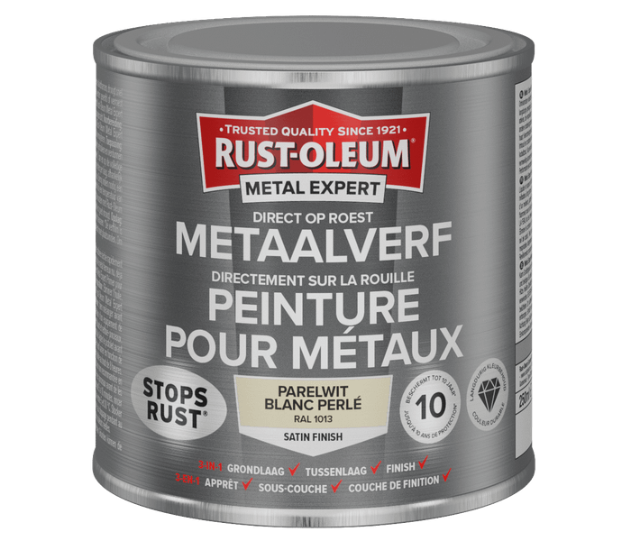 Rustoleum ist der Spezialist für Metallfarben. Mit Metallfarbe können Sie Metall eine andere Farbe verleihen. Sie können es auch als eine gute Schutzschicht auf Metall verwenden. Dies schützt Ihren Metallgegenstand vor äußeren Einflüssen wie Sonnenlicht, Wasser und Frost. Dieser Speziallack hilft auch, Kratzer und Rost zu verhindern.