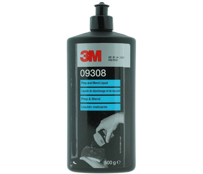 3M 09308 Prep and Blend Liquid is a roughening compound that is suitable for matting paints prior to recoating or blending with a new layer of clear coat, ideally in combination with the ultra-fine abrasive fleece Scotch-Brite. The product can also be used to roughen a paint or surface. The agent can be easily applied to surfaces to remove grease, resins, silicones, oils, etc. By using the 09308 Prep and Blend Liquid with Scotch-Brite abrasive pads, you will obtain a uniform frosted surface with a fine scratch pattern.