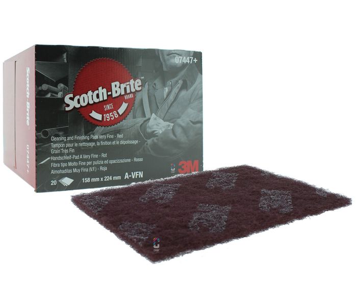 3M 07447 Scotch-Brite RED Sanding Pad can be used for the most varied finishing and sanding jobs. It has been developed for finishing primer and (clear) varnish. 3M Scotch-Brite Hand Pad combines flexibility with effective cutting action and precise hand control to accomplish tough cleaning jobs or produce fine finishing results, use after use. Very fine grade aluminum oxide abrasives cut fast and fine, leaving a smooth, finished surface. Suitable for use on a wide variety of materials and for many different tasks.