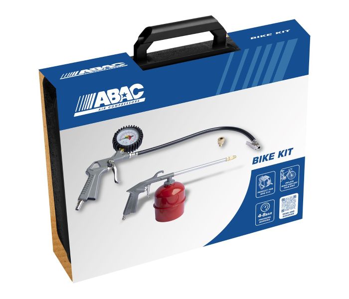 ABAC Compressed Air Bike Set in Case includes a tire pump and wash gun. With this ABAC bike set, you can inflate tires and clean the bike by spraying with water and detergent. This 2-piece air bike set from ABAC comes in a case so you can store and carry everything neatly.