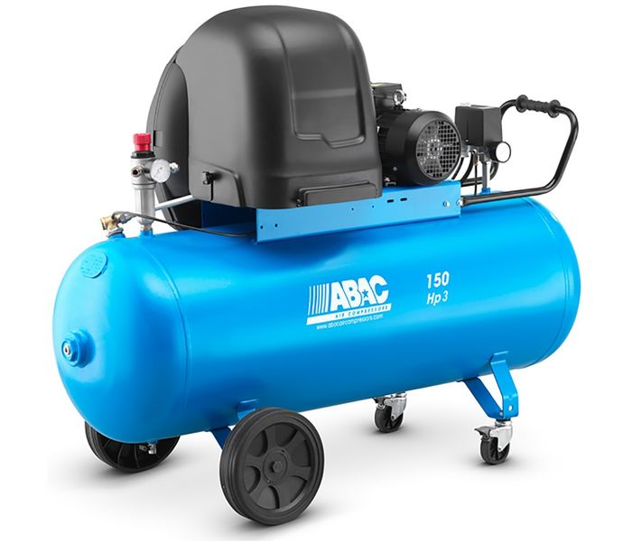 ABAC S A39B 150 CM3 Compressor with 150 liter tank delivers 393 liters of compressed air per minute and has a maximum pressure of 10 bar. This ABAC professional compressor 150 liters is suitable for Heavy Duty air tools. Despite having a large 150 liter compressed air tank, the ABAC S A39B 150 CM3 can be used as a mobile compressor thanks to four wheels and a handle.