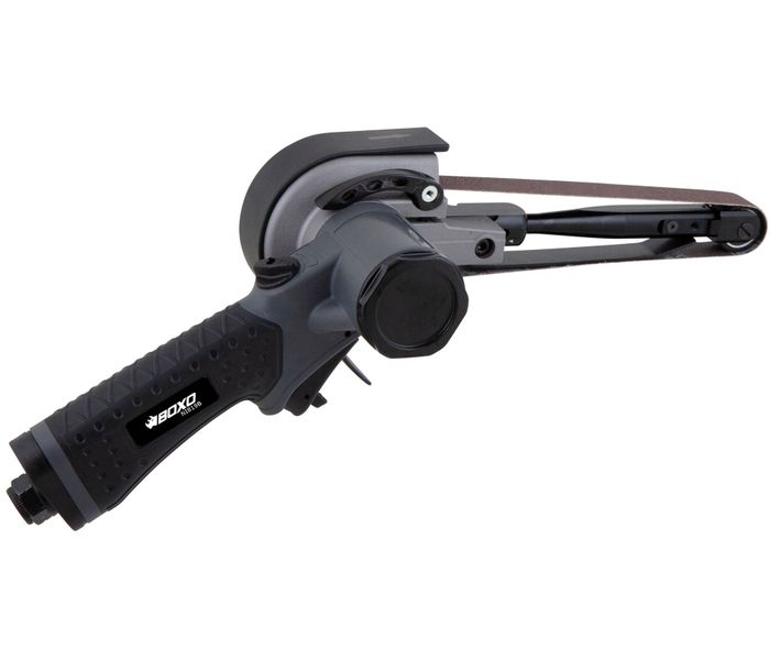 BOXO Belt Sander 20x330mm for air sanding with sanding belts. This pneumatic belt sander has an ergnonomic design, 18,000 rpm speed and holder for 20x330mm sanding belts. The pneumatic belt sander has a strong composite housing that is resistant to drops, impacts, oil and water. This BOXO belt sander is 360° rotatable so you always have the right angle while sanding.