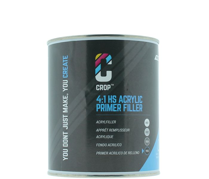 CROP 4:1 2K Acrylic Primer Filler BLACK VS5 1 liter is a dark primer that adheres strongly to metal, aluminum, galvanized steel, on plastic primer, putty and existing lacquer or paint that is in good condition. This black HS 2K primer filler fills surface imperfections such as small holes, cracks, micro pinholes, sanding scratches and other imperfections. In addition, the primer black is fast drying and you can easily sand the primer to a smooth surface. After drying, you can refinish the High Solid primer with 1K and 2K lacquers or paints both thinner- and water-based.