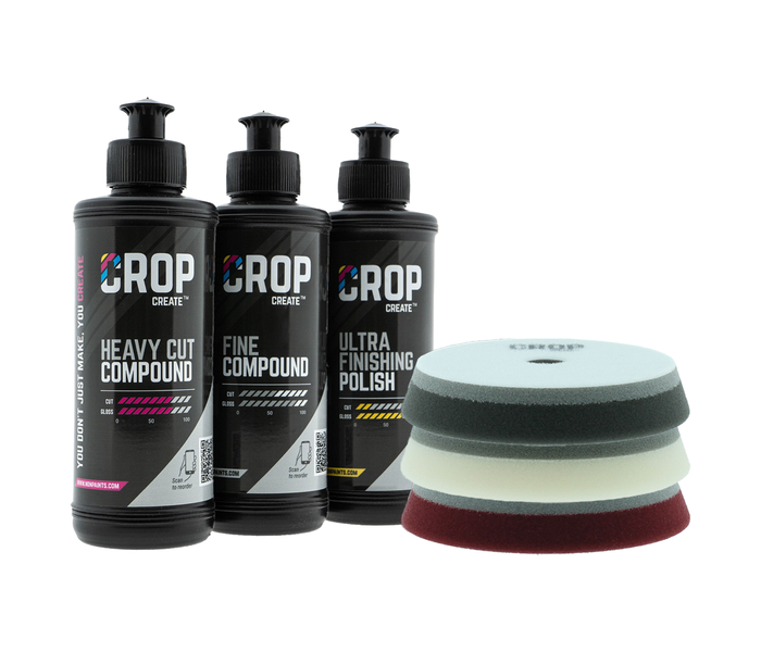 Do you have a polisher with 125mm backing pad and want to polish a car yourself in several steps? With this car detailing polishing set 125mm from CROP, you'll have professional polishes with matching polishing pads in your possession for the best results on any type of paint. The included CROP interface polishing discs have 125mm Velcro straps making them a perfect fit on your polishing machine with 125mm round pad. Because these polishing discs are matched to the polishing compounds, you have the best combination for every step during polishing for fast, effective and safe results. With this professional car detailing polishing set 125mm you are able to polish car paint with any polishing machine yourself with amazingly sleek and shiny clear results!