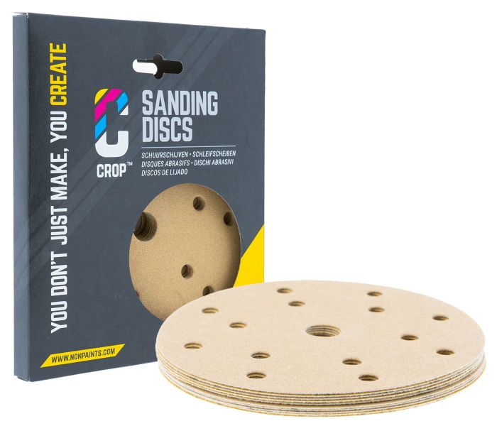 Sanding Disc 150mm P320 from CROP are packed as 10 sheets per grit size. This CROP Premium sanding disc 150mm with P320 aluminum oxide grit can be used for any sanding job. Whether you want to sand paint, varnish, putty, primer, stain, varnish or other coatings, to completely bare surfaces and substrates. The CROP Gold sanding disc P320 delivers excellent performance with smooth and even results. Thanks to the 15 holes for dust extraction, you can sand dust-free, preventing the disc from filling up with sanding dust. As a result, you work cleaner, enjoy longer tool life and a nicer finish. Because the CROP Gold sanding disc 150mm is round with Velcro, you attach it to your eccentric sander with 150mm backing pad or your hand sanding block.