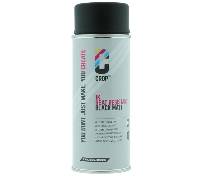 CROP Heat Resistant Paint Black is a matte spray paint that resists heat and high temperatures. This heat resistant paint black matte can withstand temperatures up to 800°C, has high opacity and is fast drying. The special lacquer makes this paint heat resistant, allowing you to spray surfaces that get hot.