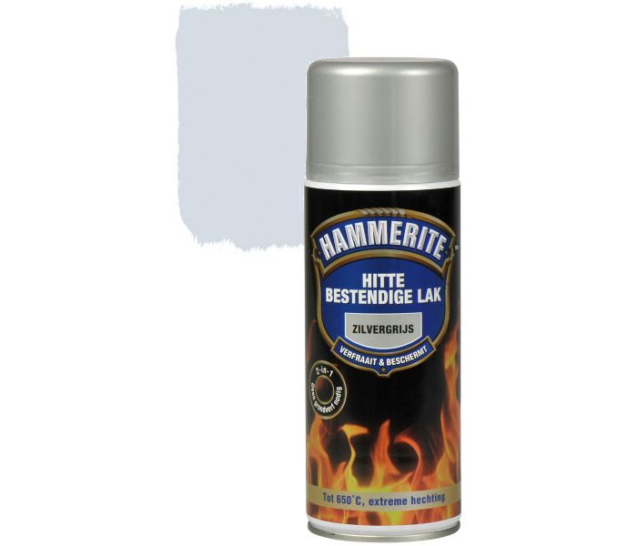 Hittebestendige verf zilver is een lak die bestand is tegen hitte, hoge temperaturen en vuur tot 600 graden Celsius. De Hammerite hittebestendige verf zilver mat heeft een hoge dekkracht, kan je zonder primer direct op metaal spuiten en geeft na het sprayen een duurzame bescherming. Dankzij de hoogwaaardige kwaliteit lak is de mat zilver hittebestendig verf sneldrogend en kleurecht.
