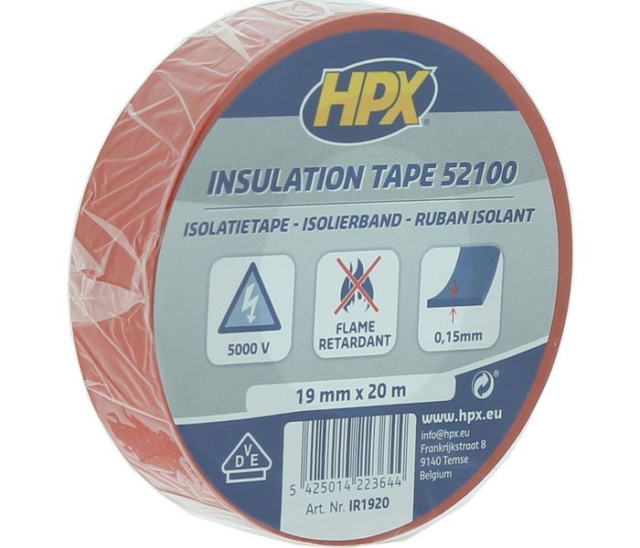 HPX 52100 VDE Insulating Tape RED 19mm wide on 20 meter roll for electrical insulation, protection and repair of cables, cords and wiring. This red insulation tape is VDE approved and flame retardant. This makes the high-quality insulating tape with VDE approval ideal for bundling, reinforcing or protecting electrical cables, power cords and wires.