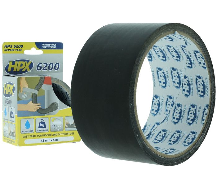 HPX Repair Tape BLACK 48mm wide on 5 meter roll for tape repairing a gutter, awning, pipe, garden hose, pipe and more. This black repair tape is waterproof, incredibly strong and has a high adhesive strength where you can tear the tape to size by hand. Thanks to strong strength, you can also use this repair tape as black duc tape.