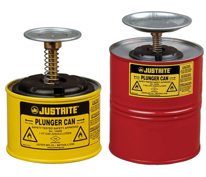 JUSTRITE Metal Plunger Cans have been specially developed for safe wetting of cloths or sponges with flammable, chemical and solvent-containing liquids. Flammable and solvent-containing liquids can be safely stored. Cloths or sponges can be safely soaked with a flammable liquid. For example: thinners, petrol, acetone, degreasers and other solvent-containing liquids. These cans are made of high-quality powder coated metal that are resistant to chemical and thinner based fluids.