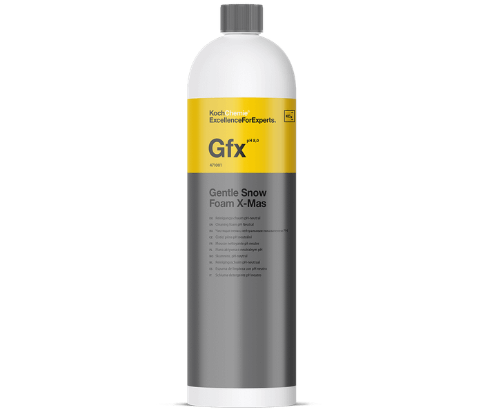 Koch Chemie Gentle Snow Foam X-Mas is a limited edition pH-neutral car shampoo with the scent of roasted apple and cinnamon. Can be used as snow foam in a foam lance or foam gun, or as a shampoo for manual washing. Koch Chemie Gfx creates a thick, even, snowy blanket of foam that adheres to car paint and lifts dirt from the surface. Due to its pH-neutral formula, waxed or sealed surfaces are not affected.