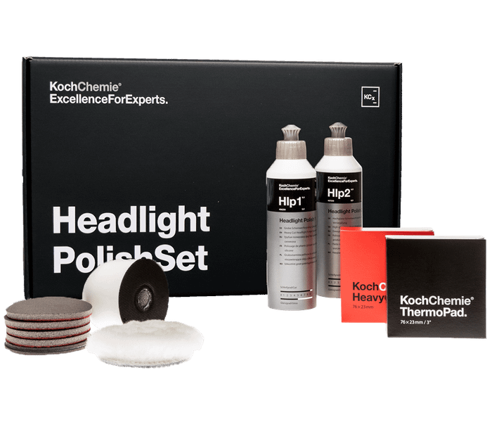 Koch Chemie Headlight Polish Set contains all the products for repairing dull, yellow and damaged headlights. With this repair set, you can polish and sand dull headlights to make them look bright and like new again! This not only increases the value of the car, but also gives you better visibility on the road while driving!