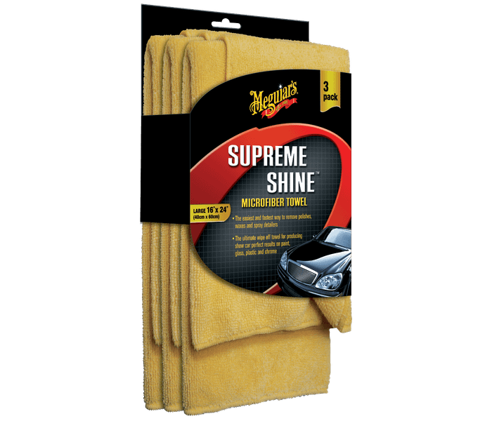 Meguiar's Supreme Shine Microfiber Towel is a super absorbent microfiber towel. The Supreme Shine Microfiber Towel is made with a deep, double-sided pile that easily wipes away wax and creates a smooth, mirror-like shine. The thirsty fibers can absorb three times more water than a terry cloth towel. This microfiber drying towel is perfect for quick and safe drying of cars, vans, trucks, motorcycles, scooters and other surfaces.