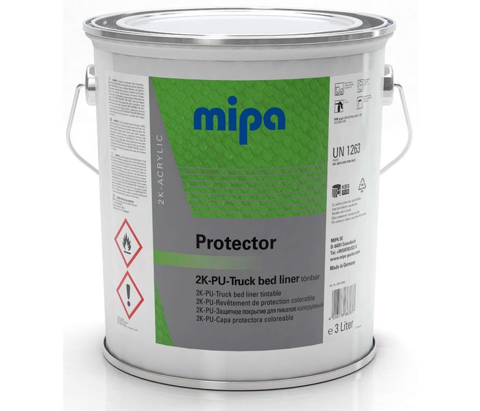 To this 3 liters of MIPA Protector you need to add 1 liter of MIPA H10 hardener and 1 liter of colorable base coat paint. This gives you a total of 5 liters to completely spray a car in bedliner paint. Do you have a pickup truck, 4x4 off-road vehicle or other large surface? Then you need at least this 5 liters of MIPA Protector Tintable.