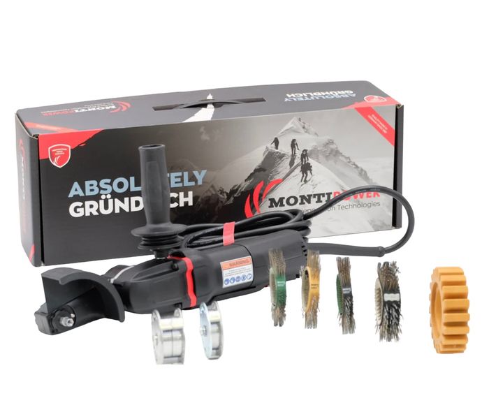 Montipower MBX is a versatile tool that easily removes rust, corrosion, oxidation, adhesive residue, gaskets, paint layers, undercoating, sealants and vinyl in one step. In addition, you can neatly finish welds. The flexible wire brushes rotate in a patented housing, moving outward with centrifugal force and operating on an air cushion. The specially designed bristles are U-shaped staples securely attached to a durable nylon strap, ensuring safe and long-lasting operation.