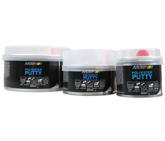 MoTip Polyester putty is a universal 2K filler for polyester, steel, aluminum, wood and concrete. This 2-component universal poly putty smooths out unevenness in these surfaces. Afterwards, it can easily be sanded to a completely tight surface. Thanks to its elasticity, this 2K putty is ideal for plastic bumpers and parts.