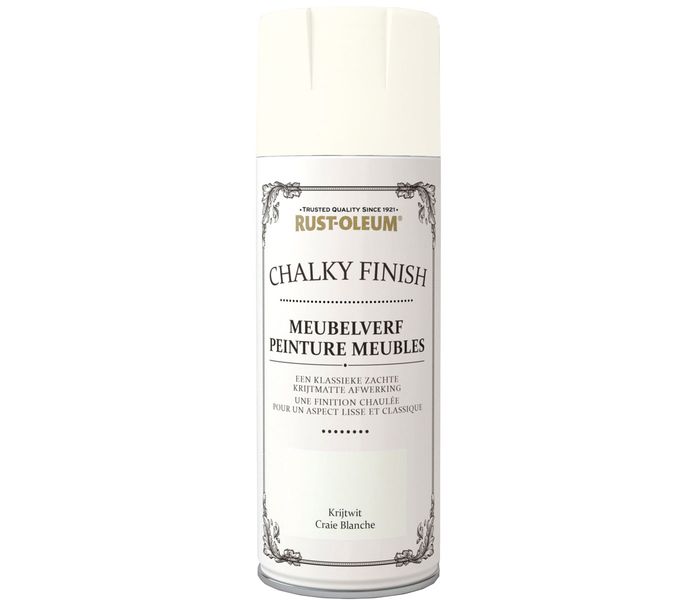 Rust-Oleum Chalky Finish Furniture Paint spray can is a chalk paint in a 400ml spray for spray painting furniture, chairs, cabinets, sofas and other surfaces. Rust-Oleum's Chalky furniture paint spray can has a classic matte look and is available in 6 colors. This spray chalk paint for furniture is water-based, making it safe for any surface and virtually odorless. Because the Chalky furniture paint is highly concentrated, the chalk paint covers furniture in one coat!