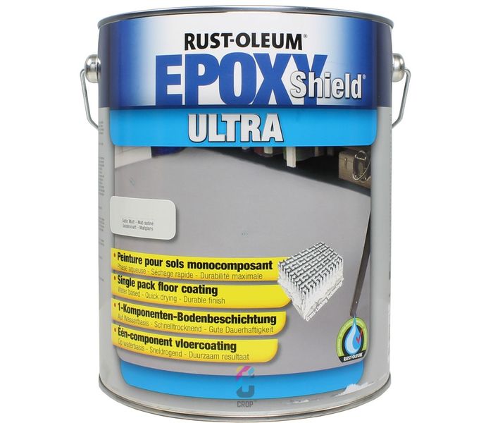 Rust-Oleum EPOXYSHIELD ULTRA A quick-drying single pack water-based floor coating (epoxy-modified acrylic) for light to medium duty (normal foot traffic/limited vehicular traffic). Good resistance to diesel, motor oil, coolant fluid, various household chemicals and most types of tyre.