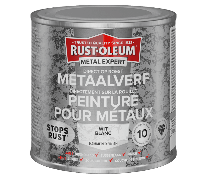 Rust-Oleum Metal Expert Direct On Rust Hammer blow Paint has a hammerblow finish with a beautiful appearance of beaten metal for iron and steel. The metal paint contains a unique 3-in-1 technology: primer, intermediate coat and finish coat all in one. Can be applied directly to bare, previously painted or rusty ferrous metal.
