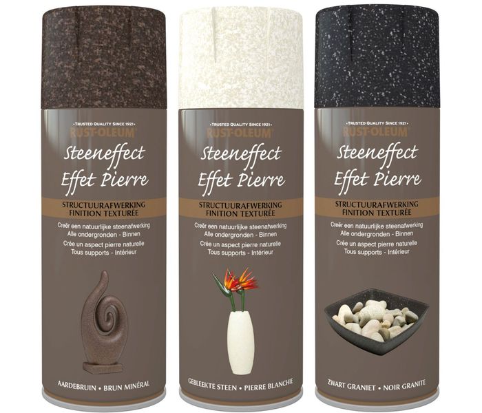 Spuitbus steeneffect van Rust-Oleum is leverbaar in 3 kleuren. Iedere kleur steen effect verf heeft een hoge dekking en textuur van echt steen. Kies uit onderstaande 3 kleuren steen effect lak.