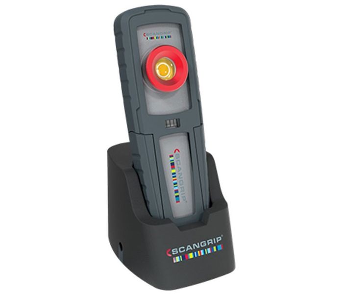 SCANGRIP Color Match hand lamp is equipped with a 3.7 Volt strong battery that is fully charged within 4 hours. When buying this colormatch lamp you also receive the magnetic charging station, where you can neatly store the lamp after use while it is being charged immediately. The handy battery indicator on the front of the lamp shows how full or empty the battery is.