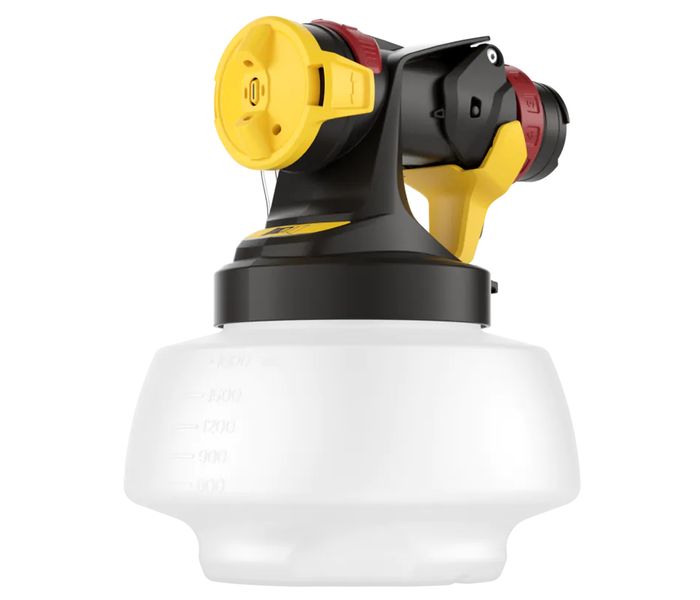 Wagner HVLP Flexio Spray Attachment - Wall Extra I-spray 1800 is a powerful spray top for interior wall paint, ideal for quick and even application of latex and dispersion paints. With a capacity of 1.8 liters and the innovative I-Spray technology, it delivers fine atomization and a perfect covering result. The spray jet is adjustable in width and direction, and the air flow is infinitely adjustable, making it suitable for both thin and thicker paints.