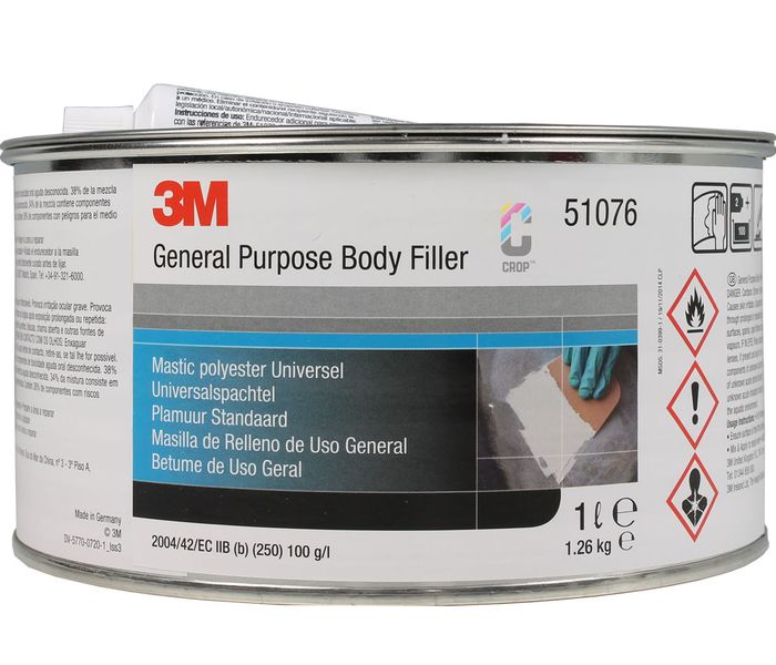 La Masilla 3M 51076 2K es una pasta universal de poliéster de 2 componentes para rellenar agujeros y abolladuras en todos los sustratos. La Masilla 3M 51076 está especialmente desarrollada para el usuario profesional y es conocida por su gran capacidad de relleno, es fácil de aplicar, extender y lijar. Una vez curada, esta masilla de dos componentes se puede volver a pintar con cualquier pintura de automoción, tanto al agua como convencional.