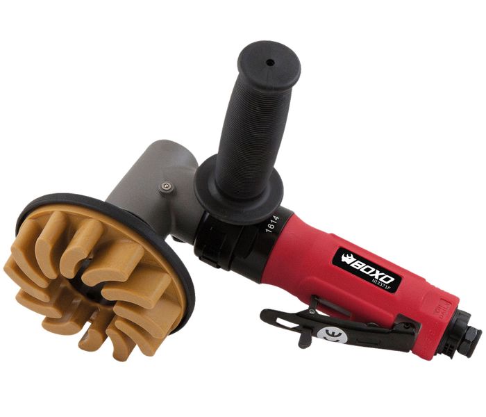 El removedor de pegatinas en ángulo BOXO es un decapador neumático que permite eliminar rayas, restos de pegamento y pegatinas. Al decapador neumático con cabezal en ángulo se le acopla un disco de caramelo especial que cubre una superficie mayor que la de otros decapadores. Esto le permite utilizar este quita-pegatinas acodado para eliminar pegatinas grandes sin dañar la pintura ni la superficie.
