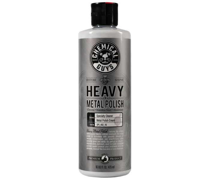 Heavy Metal Polish está especialmente diseñado para eliminar el deslustre del cromo, el acero inoxidable, el aluminio, el cobre, el latón, el oro y la plata. El abrillantador para metal puede utilizarse en parachoques metálicos, llantas cromadas, embellecedores y tubos de escape.
