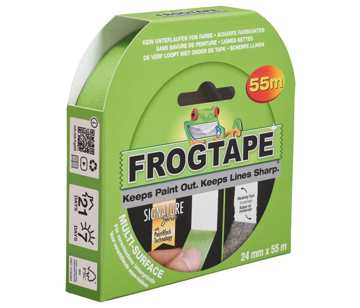 FrogTape Multi Surface es la mejor cinta de pintor para líneas de pintura ultra nítidas y un resultado final perfecto. La cinta de pintor es muy adecuada para sustratos lisos, pintados, secos y madera sin tratar.
