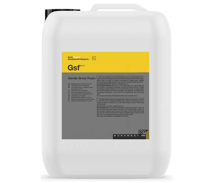 Koch Chemie Espuma Nieve suave es una espuma para nieve de pH neutro y alta formación de foam con un agradable aroma a cereza para que su experiencia de lavado de coches sea aún más placentera. Puede utilizarse como espuma de nieve en una lanza o pistola de espuma, o como champú para el lavado manual. Koch Chemie Gsf crea una gruesa y uniforme capa de espuma de nieve que se adhiere a la pintura del coche y levanta la suciedad de la superficie. Gracias a su fórmula de pH neutro, las superficies enceradas o selladas no se ven afectadas.