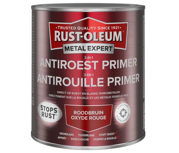 Rust-Oleum Metal Expert 3 en 1 Anti Rust Primer es una imprimación anticorrosión profesional para metales ferrosos. La imprimación anticorrosión de secado rápido proporciona la capa base perfecta sobre la que se puede aplicar una pintura metálica al agua o al disolvente. El metal es una superficie complicada de pintar y aún lo es más si no se utiliza imprimación para metal.