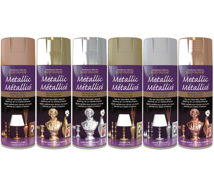Rust-Oleum Metallic Spray Paint es un bote de pintura metalizada en spray de alta cobertura apto para uso en interiores y exteriores. Esta resistente pintura metalizada en spray se seca rápidamente, puede pulverizarse sobre cualquier superficie y es conocida por su alto poder cubriente. Rust-Oleum Metallic Spray Paint está disponible en 7 bonitos colores metalizados que se pueden pulverizar directamente sobre cualquier superficie sin necesidad de imprimación.
