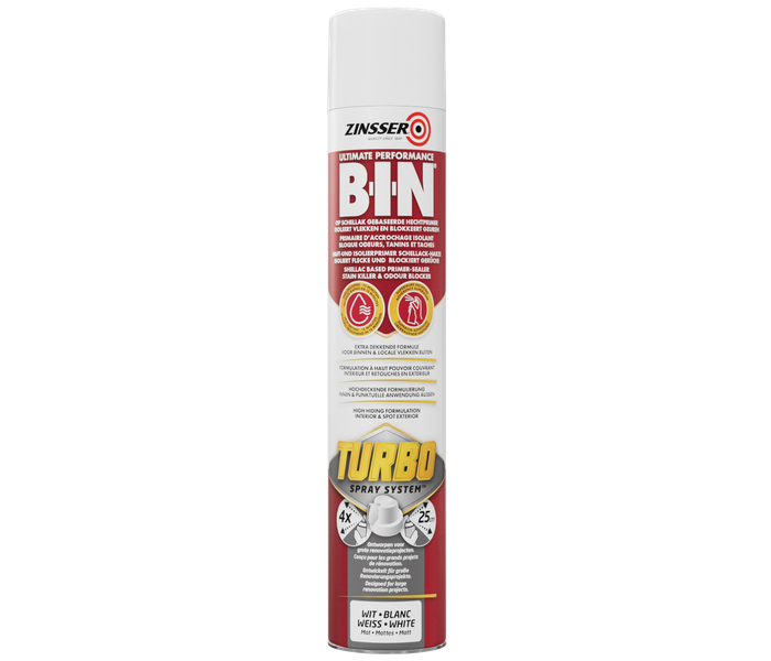 BIN Turbo ofrece la misma calidad fiable que el BIN clásico, pero con mayor facilidad de uso y rapidez. Mientras que la variante normal ya es conocida por su rápido tiempo de secado y fuerte adherencia a madera, metal, yeso y azulejos, la Turbo va un paso más allá: gracias a su fórmula en aerosol, se trabaja más rápido, de forma más uniforme y sin brocha ni rodillo. Esta imprimación bloquea manchas difíciles como hollín, anillos de agua, grasa, nicotina y sangre, y evita que se vean a través de las capas de pintura. Ideal para imprimaciones puntuales y superficies difíciles de alcanzar, tanto en interiores como para pequeñas aplicaciones en exteriores.