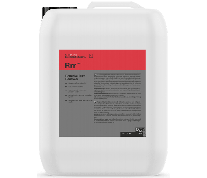 Koch Chemie Reactive Rust Remover est un puissant produit décapant de rouille volante à pH neutre, développé à partir de substances réactives. Il permet d'éliminer la rouille superficielle, les particules de fer, la poussière de frein brûlée et d'autres contaminants non organiques. Une fois les contaminants dissous, il se colore en violet.