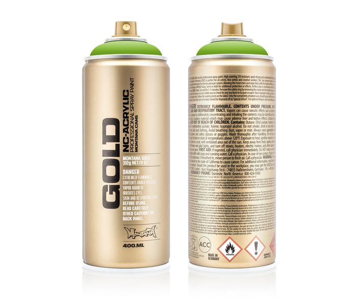 L'aérosol pour graffiti Montana Shock Green Light de la série GOLD est conditionné dans une bombe à basse pression. Comme la bombe aérosol Montana GOLD est un spray basse pression, vous pouvez pulvériser la peinture graffiti de manière très contrôlée avec un contrôle optimal du résultat. La peinture aérosol Montana GOLD Shock Green Light S6000 sèche rapidement et en douceur, même par temps froid. Grâce à la formule spéciale anti-goutte, vous évitez les coulures!