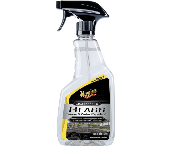 Meguiar's Ultimate Glass Cleaner & Water Repellent combine un excellent nettoyage des vitres avec des propriétés hydrofuges avancées, créant une tension de surface qui repousse l'eau des vitres extérieures, des systèmes d'aide à la conduite et des capteurs.