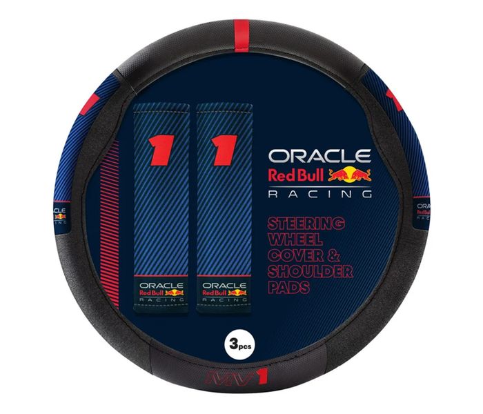Housse de volant Red Bull Oracle + coussins d'épaules MV1 donnent à votre voiture une apparence sportive et confortable avec le design reconnaissable MV1. Ce ensemble de 3 pièces en noir, rouge et bleu est un produit officiellement licencié de Red Bull Racing et idéal pour les fans de Formule 1. Fabriqué en 100% PU pour une finition durable et un confort de conduite accru.