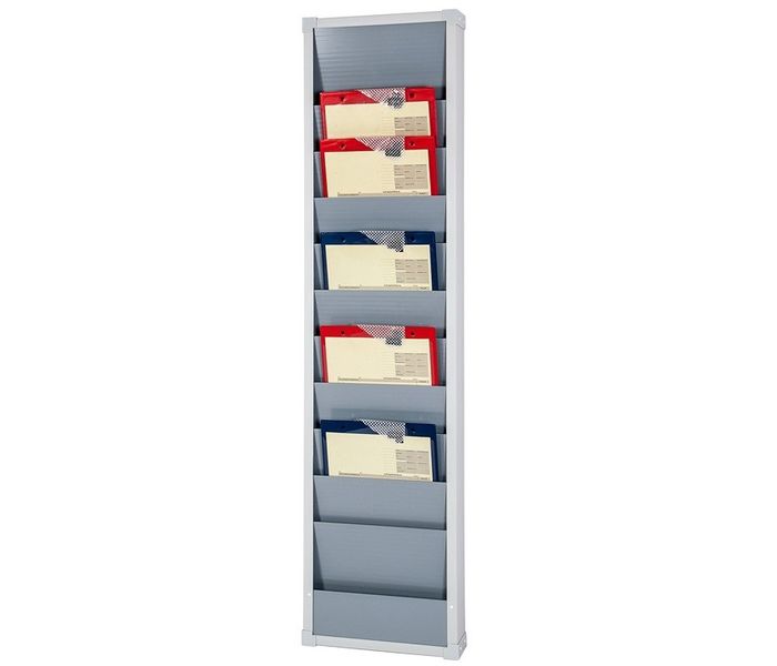 Tableau de planification des bons de travail pour 10 emplacements de dossiers de travail mesurant 1282x315x76mm et avec barre de temps. Ce tableau de planification des bons de travail est spécialement conçu pour ranger les bons de travail DIN A4 et les dossiers de bons de travail de manière organisée dans la zone d'accueil.