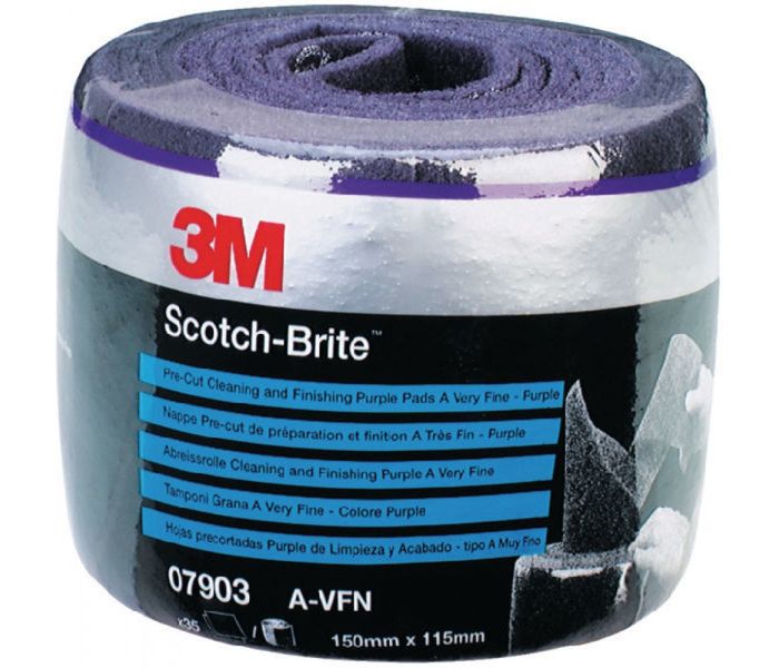 itamponi abrasivi 3M 07903 Scotch-Brite di colore viola sono fogli di vello abrasivo perforati, ognuno dei quali misura 115x150 mm. I tamponi abrasivi pretagliati 3M 07903 sono confezionati in 36 pezzi su un rotolo di vello abrasivo. Questi pad di levigatura in tessuto non tessuto sono ideali per la levigatura di angoli e spigoli vivi. Il vello abrasivo assorbe la pressione durante la levigatura manuale di aree, angoli e spigoli vivi.