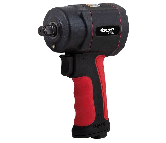 Chiave a percussione BOXO modello corto con attacco quadro da 1/2" e coppia di 700Nm per il serraggio e l'allentamento professionale di bulloni e dadi. Questo avvitatore pneumatico a impulsi è corto 96 mm, con un alloggiamento leggero in materiale composito e un design ergonomico per un uso confortevole. Il grilletto dell'avvitatore pneumatico consente di variare il numero di giri per controllare la velocità di avvitamento e allentamento.