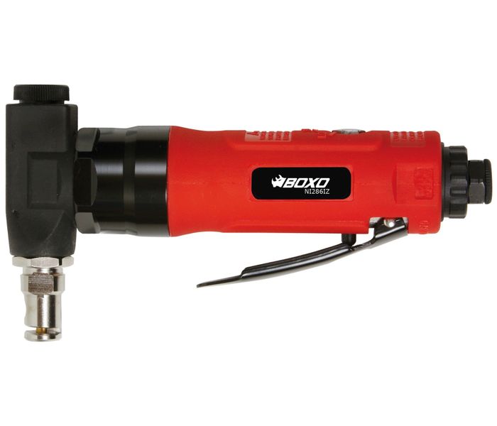 Boxo Roditrice per il taglio di lamiere. Questo morditore pneumatico è in grado di eseguire facilmente giri durante il taglio del metallo senza danneggiare la lamiera. BOXO Nibbler può tagliare fino a 1,5 mm e ha una velocità elevata di 2600 giri al minuto. Grazie all'alloggiamento in materiale composito di alta qualità, la roditrice è resistente a cadute, urti, acqua e olio.
