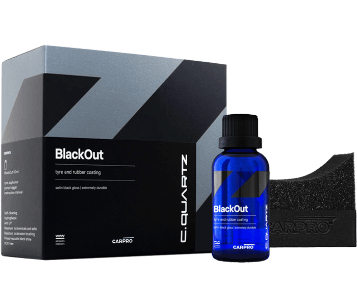CarPro C.Quartz BlackOut Tyre Coating è il rivestimento ideale per pneumatici, superfici in gomma e plastica. Il rivestimento per pneumatici combina due formule per creare un aspetto nuovo e duraturo. BlackOut Tire & Rubber Coating è un prodotto autopulente e idrofobico che lavora anche per mantenere l'aspetto nero satinato.