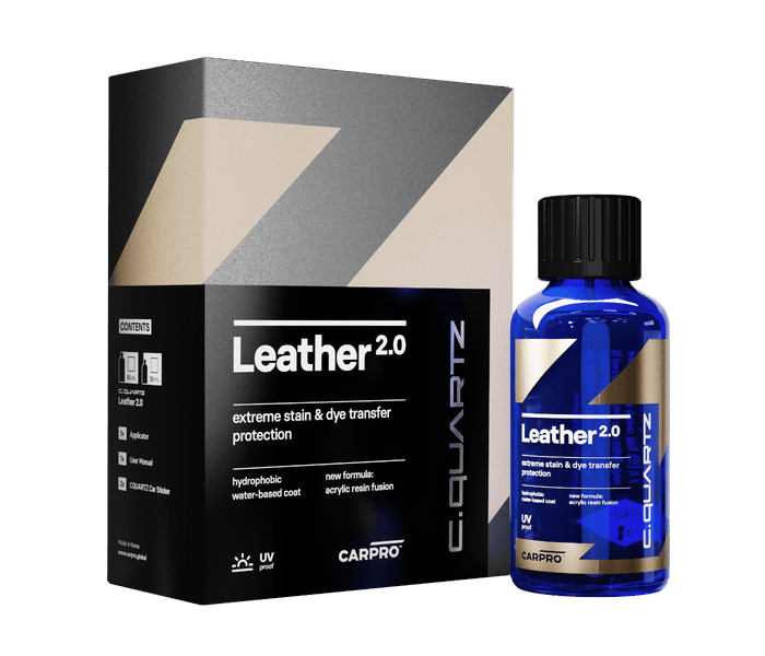 CarPro CQuartz Leather 2.0 è un rivestimento per pelle appositamente formulato per proteggere pelle e vinile. Il rivestimento è a base d'acqua quindi sicuro da usare su tutti i tipi di pelle, anche sulla pelle Nappa. Ha proprietà idrofobiche e autopulenti proteggendo la pelle in modo ottimale dai dannosi raggi UV, dall'usura e dalle macchie.