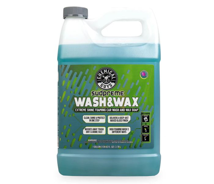 Chemical Guys Sudpreme Wash & Wax è uno shampoo per auto di qualità superiore con una formula ricca di schiuma che rimuove senza fatica lo sporco lasciando uno strato protettivo di cera. La formulazione a pH neutro è sicura per tutte le vernici, i rivestimenti e gli strati di cera. Grazie a polimeri avanzati, crea una profonda lucentezza e un effetto idrorepellente. Perfetto per chi vuole risparmiare tempo combinando lavaggio e ceratura in un unico passaggio.