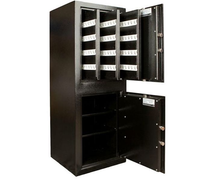 Keysafe dispone di un'area di chiusura separata nella parte inferiore con spazio per serratura elettronica di 500 x 380 x 320 mm (hxlxp) con 2 ripiani, ad esempio per targhe e numeri di targa. Questa cassaforte per chiavi è inoltre dotata di serie di fori di ancoraggio sulla parete posteriore e sul fondo; il colore standard è il nero.