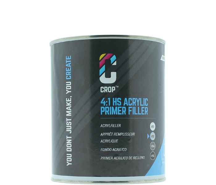 CROP HS Acrylic Primer Filler VS2 è un fondo High Solid ( Alto Solido ) di colore grigio con una buona capacità riempitiva che aderisce fortemente a metallo, alluminio, acciaio zincato, su primer plastico, stucco e vernice esistente, ideale per la verniciatura completa o parziale riempiendo le superfici irregolari come piccoli fori, crepe, microfori, graffi di carteggiatura e altre imperfezioni, inoltre, questo fondo è ad asciugatura rapida e può essere facilmente carteggiato per ottenere una superficie liscia prima di verniciare con vernici 2K o con vernici 1K a base d'acqua o solvente.