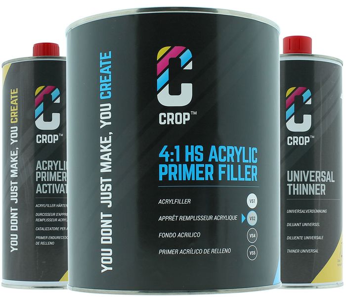 CROP HS Acrylic Primer Filler è un set di fondo CROP composto da 4 litro di fondo grigio, 1 litro di catalizzatore HS per il fondo e 1 litro di diluente. Questo set completo contiene tutto il necessario per la miscelazione del fondo 2K con il quale potrà essere carteggiato e sovra verniciato con qualsiasi base 1K all'acqua o solvente, o con qualsiasi vernice 2K.